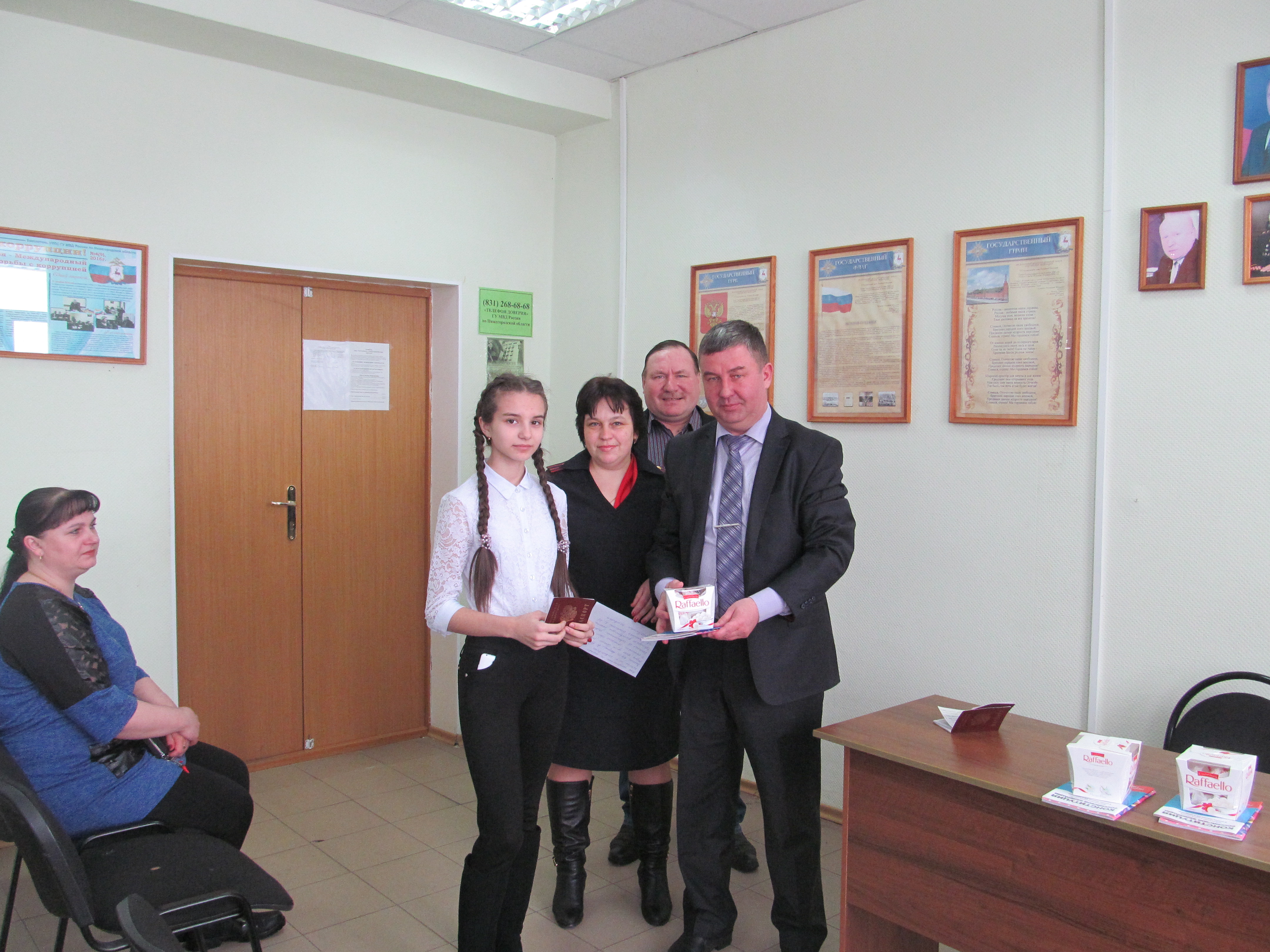 Поздравили юных девушек и вручили паспорта начальник МО МВД России «Ковернинский» подполковник полиции Голованов Владимир Григорьевич, начальник миграционного пункта МО МВД России « Ковернинский» майор полиции Прянишникова Татьяна Вячеславовна и председатель Общественного Совета МО МВД России «Ковернинский» Шавардин Валерий Владимирович. Вручая девушкам их первый официальный документ полицейские отметили, что получение паспорта – это серьезный шаг во взрослую жизнь, с этого момента им даются большие права, но одновременно возлагаются и почетные обязанности. Правоохранители пожелали школьницам бережно относится к выданному документу и достойно нести звание гражданина Российской Федерации. В свою очередь председатель Общественного Совета Шавардин Валерий Владимирович отметил, что « юные обладательницы паспортов этот день будут помнить долго! так, как сегодня они получили свой первый документ на кануне праздника, Международного женского дня». Вместе с паспортом девушки получили сладкий приз.