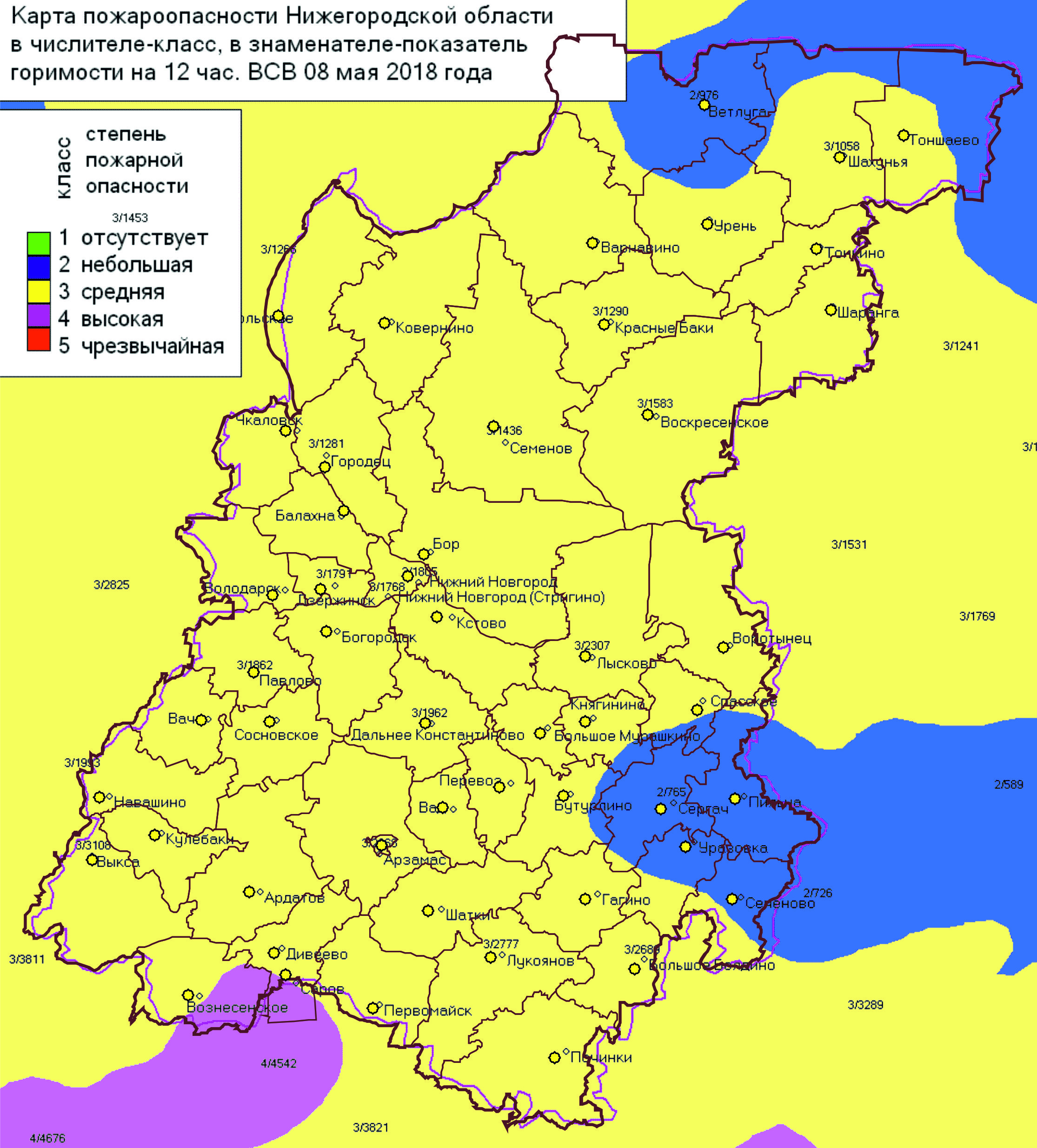 Полностью 3-й класс пожароопасности лесов установился в 38 муниципальных образованиях: г.о. г. Арзамас, г.о. г. Бор, г.о. г. Выкса, г.о. г. Дзержинск, г.о. г. Кулебаки, г.о. Навашинский, г.о. г. Нижний Новгород, г.о. г. Первомайск, г.о. Перевозский, г.о. Семеновский, г.о. Сокольский, г.о. г. Чкаловск, Ардатовский, Арзамасский, Балахнинский, Богородский, Большеболдинский, Большемурашкинский, Вадский, Варнавинский, Вачский, Володарский, Воротынский, Воскресенский, Гагинский, Городецкий, Дальнеконстантиновский, Ковернинский, Краснобаковский, Кстовский, Лукояновский, Лысковский, Павловский, Починковский, Сосновский, Тонкинский, Шарангский, Шатковский районы.