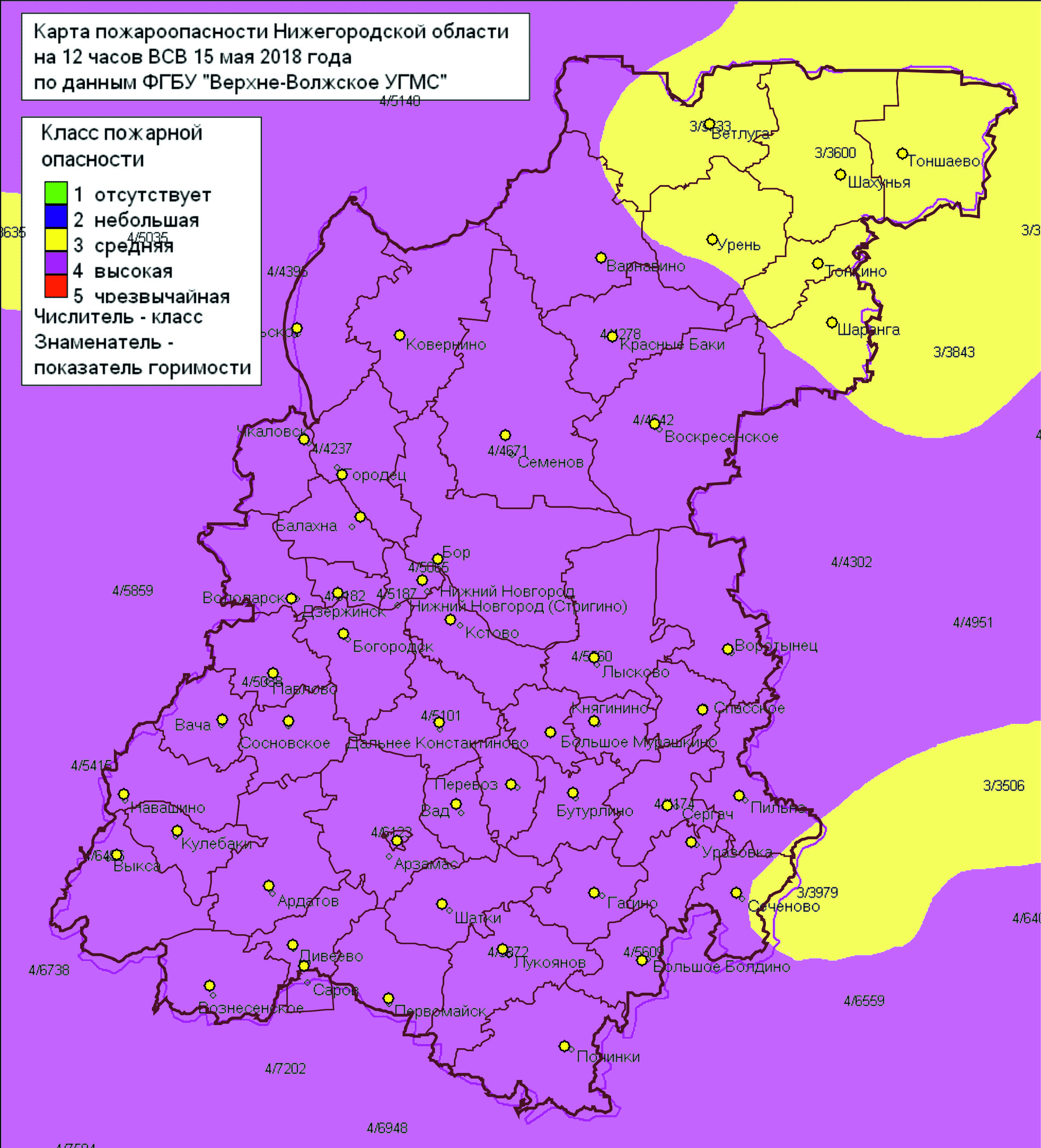 Полностью 4-й класс пожароопасности лесов установился в 43 муниципальных образованиях: г.о. г. Арзамас, г.о. г. Бор, г.о. г. Выкса, г.о. г. Дзержинск, г.о. г. Кулебаки, г.о. Навашинский, г.о. г. Нижний Новгород, г.о. г. Первомайск, г.о. г. Саров, г.о. Семеновский, г.о. Сокольский, г.о. г. Чкаловск, Ардатовский, Арзамасский, Балахнинский, Богородский, Большеболдинский, Большемурашкинский, Бутурлинский, Вадский, Вачский, Вознесенский, Володарский, Воротынский, Воскресенский, Гагинский, Городецкий, Дальнеконстантиновский, Дивеевский, Княгининский, Ковернинский, Краснобаковский, Краснооктябрьский, Кстовский, Лукояновский, Лысковский, Павловский, Перевозский, Починковский, Сергачский, Сосновский, Спасский, Шатковский районы.