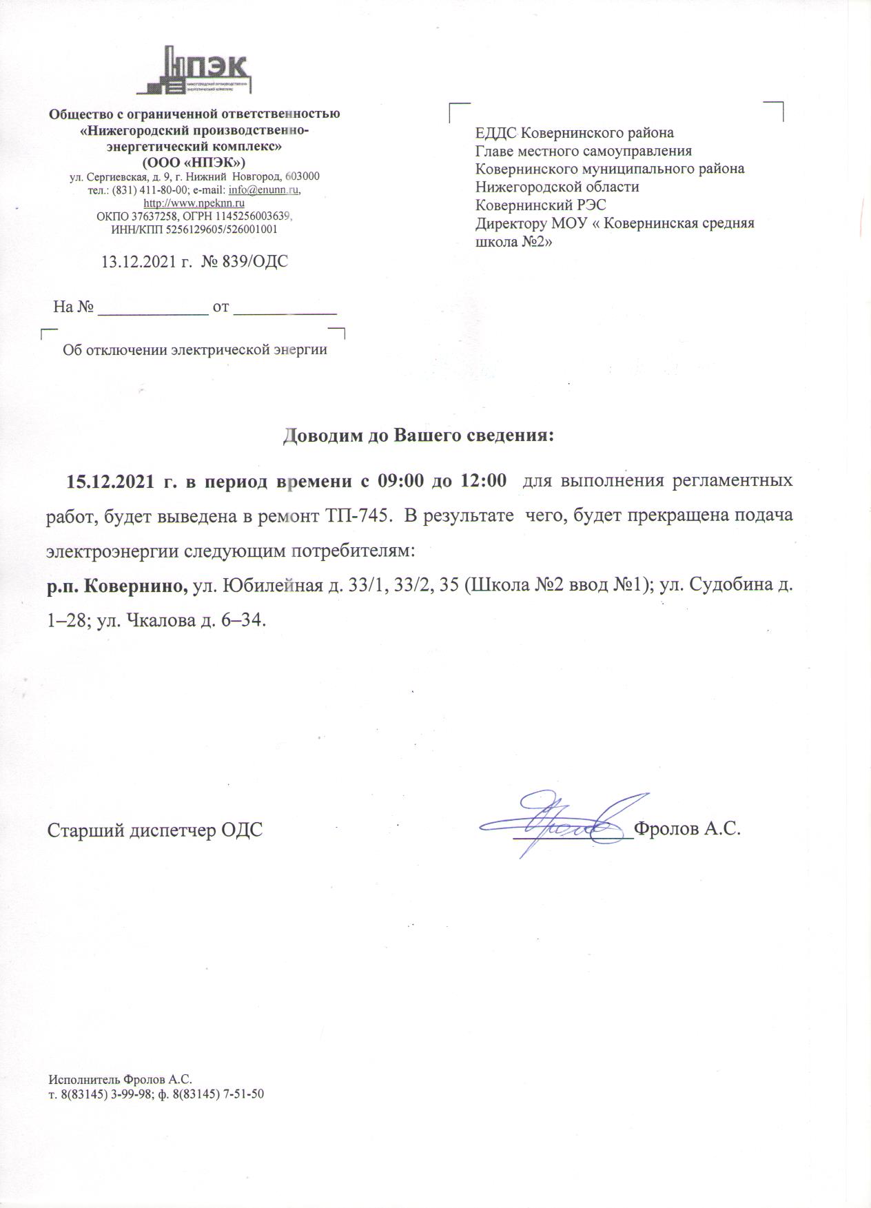 Отключение электроэнергии на 15.12.2021 НПЭК