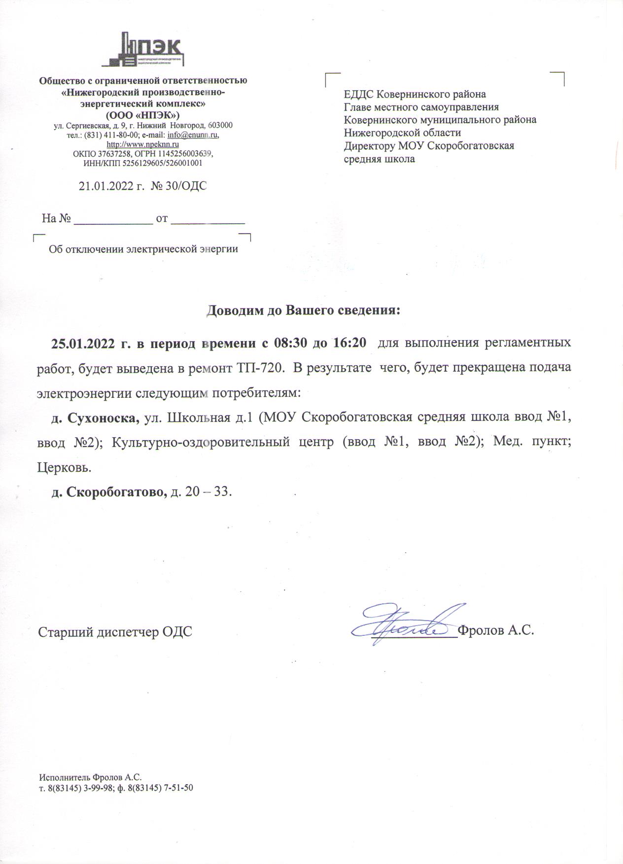 Отключение ЭЭ ООО НПЭК 25.01.2022