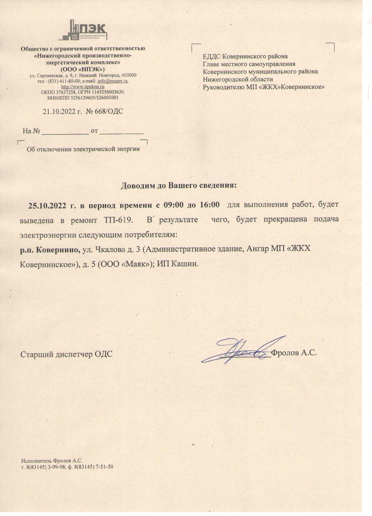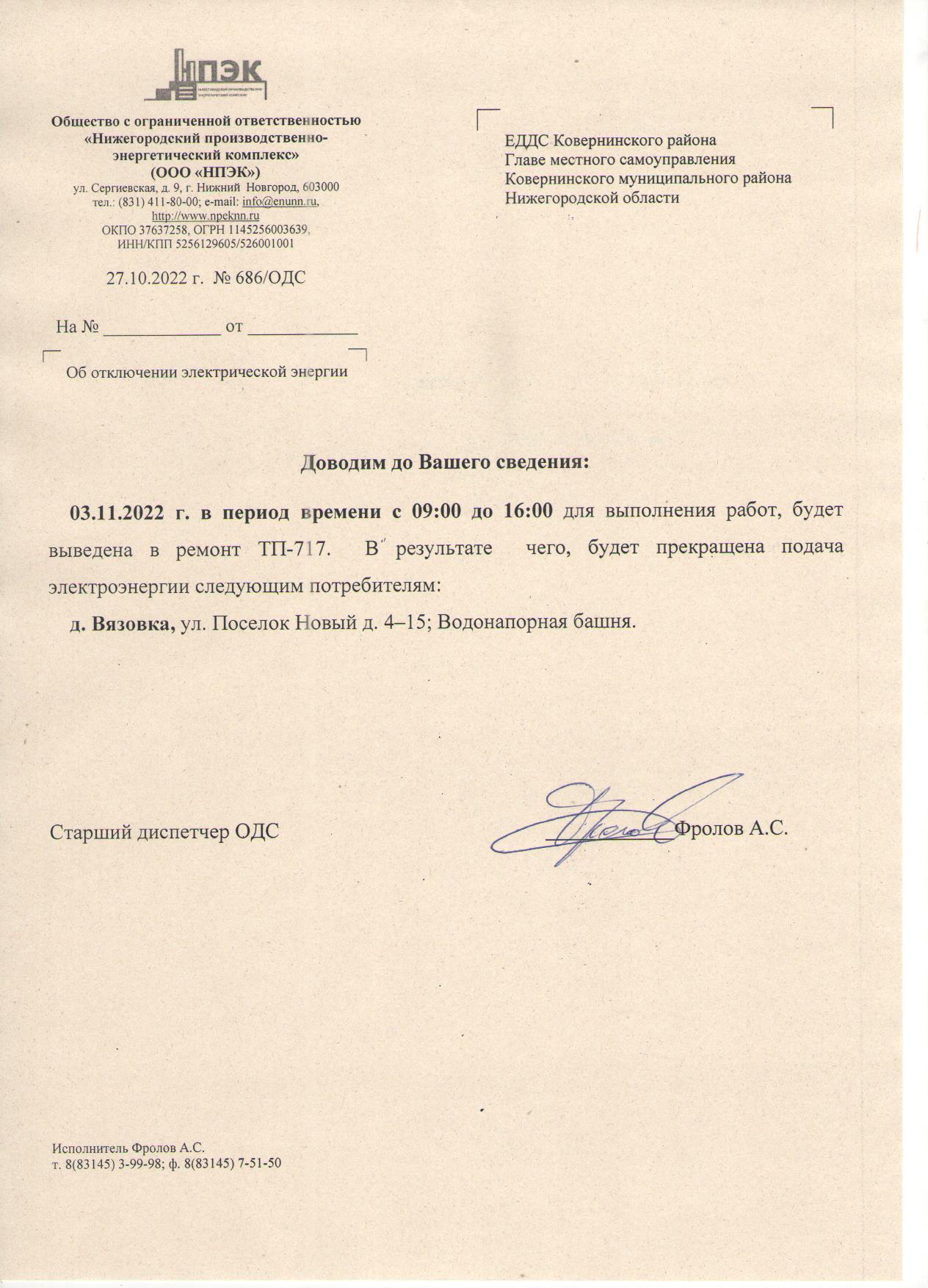 Плановое отключение ЭЭ 25.10.2022 ООО НПЭК