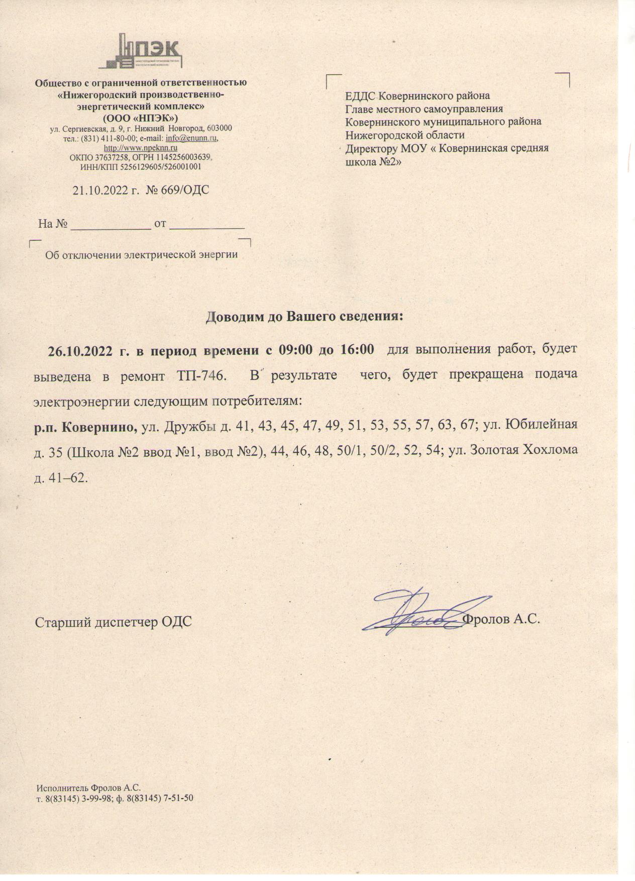 Плановое отключение ЭЭ 26.10.2022 ООО НПЭК
