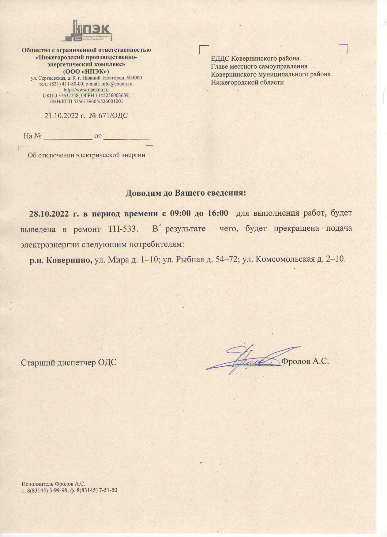 Плановое отключение ЭЭ 28.10.2022 ООО НПЭК