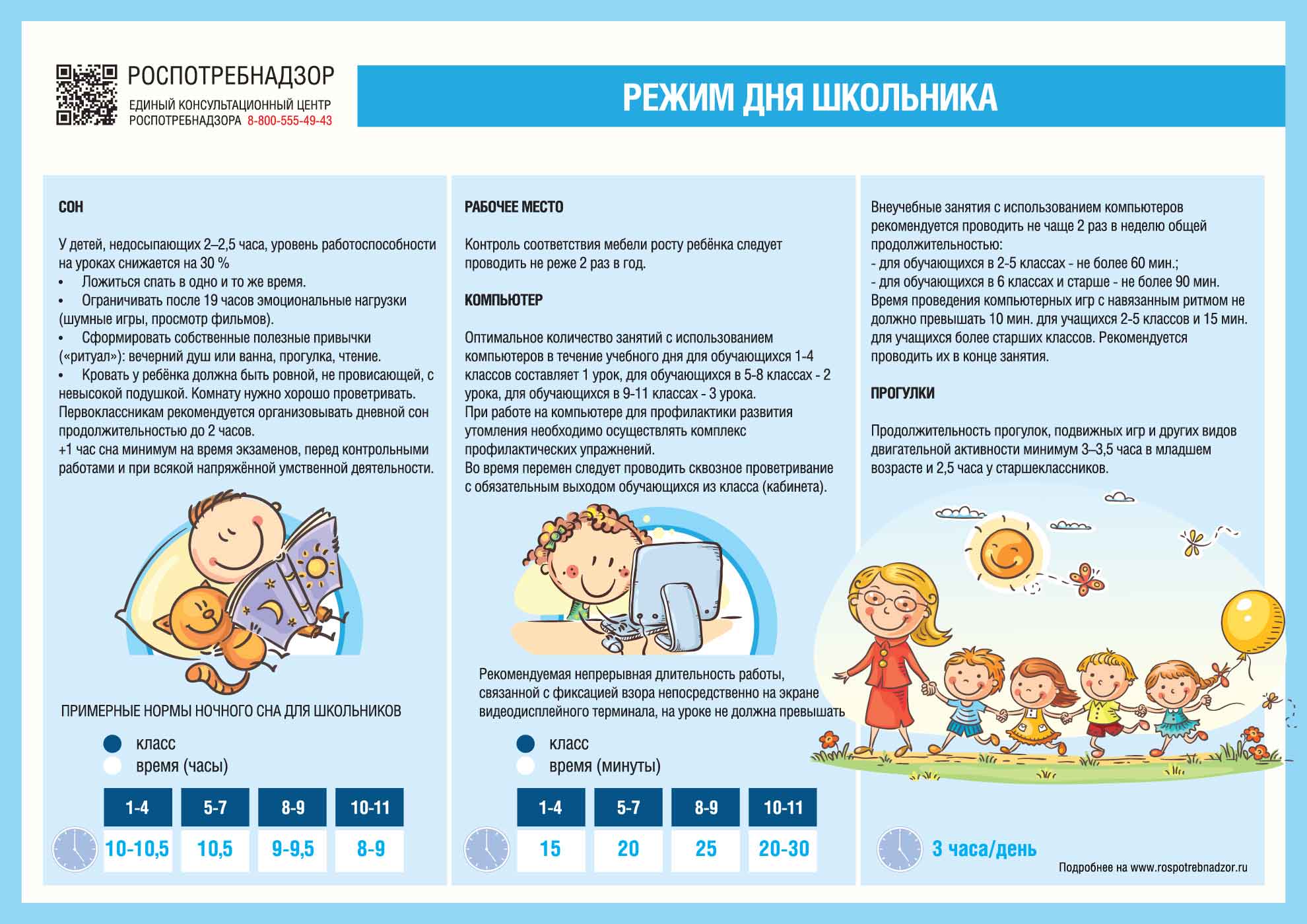 В 1–4 классе — 10–10,5 часа, в 5–7 классе — 10,5 часа, в 6–9 классе — 9–9,5 часа, в 10–11 классе — 8–9 часов. Первоклассникам рекомендуется организовывать дневной сон продолжительностью до 2 часов.