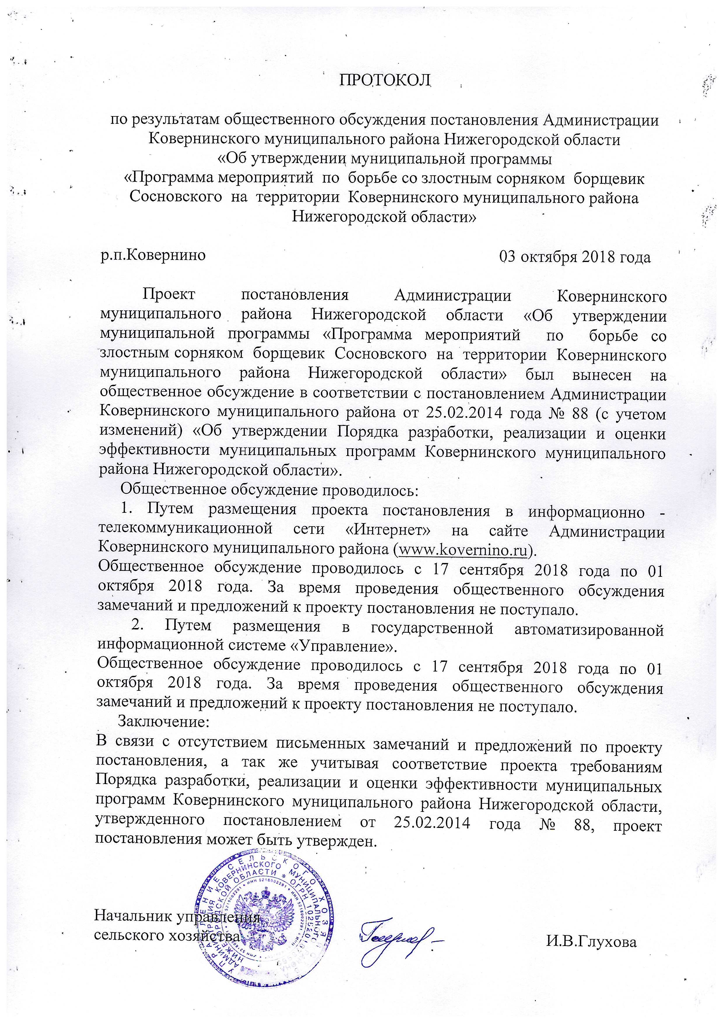 Протокол «Программа мероприятий по борьбе со злостным сорняком борщевик Сосновского на территории Ковернинского муниципального района Нижегородской области»