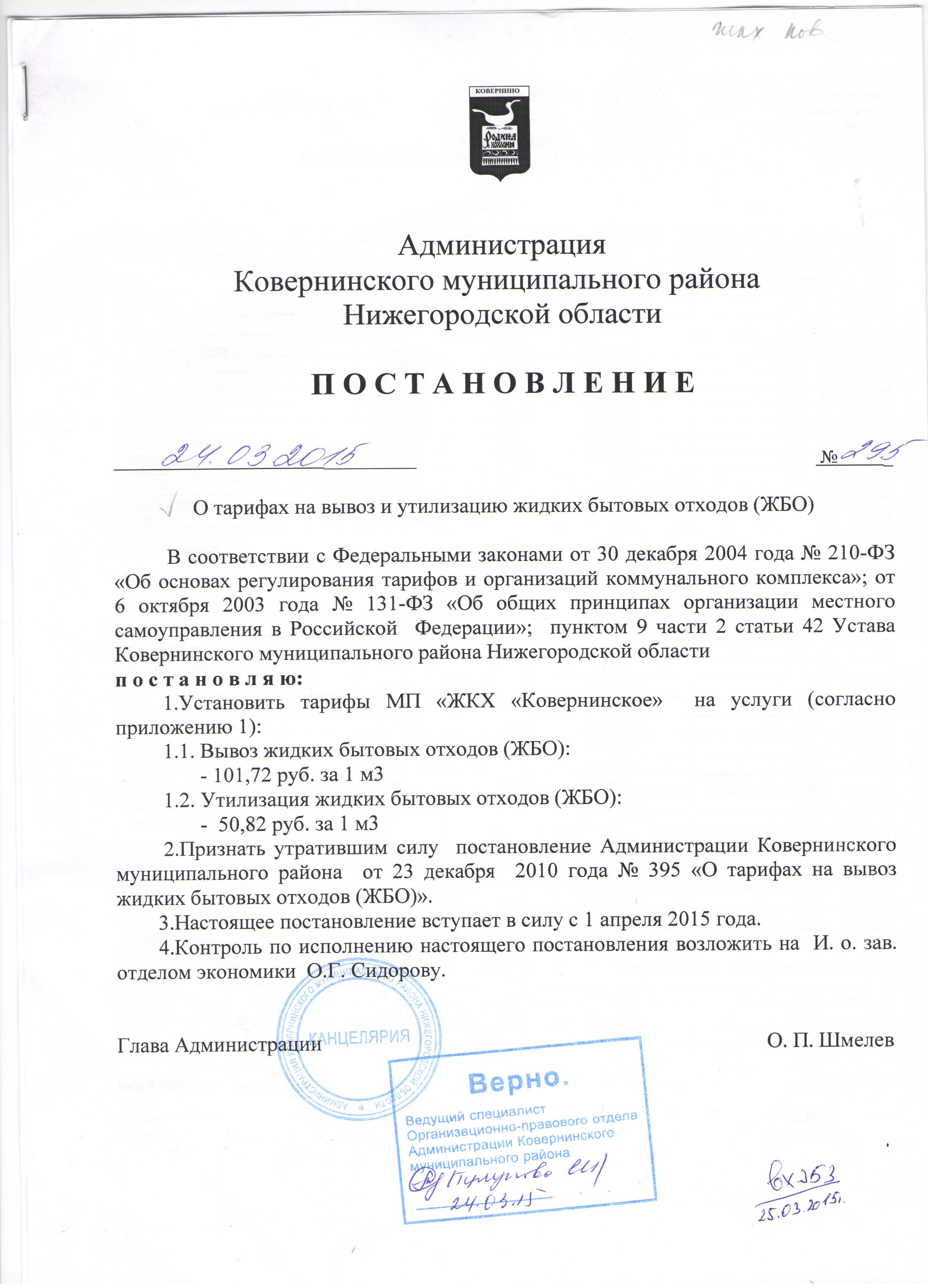 Пост.№295(1), размер платы за вывоз и утилизацию ЖБО