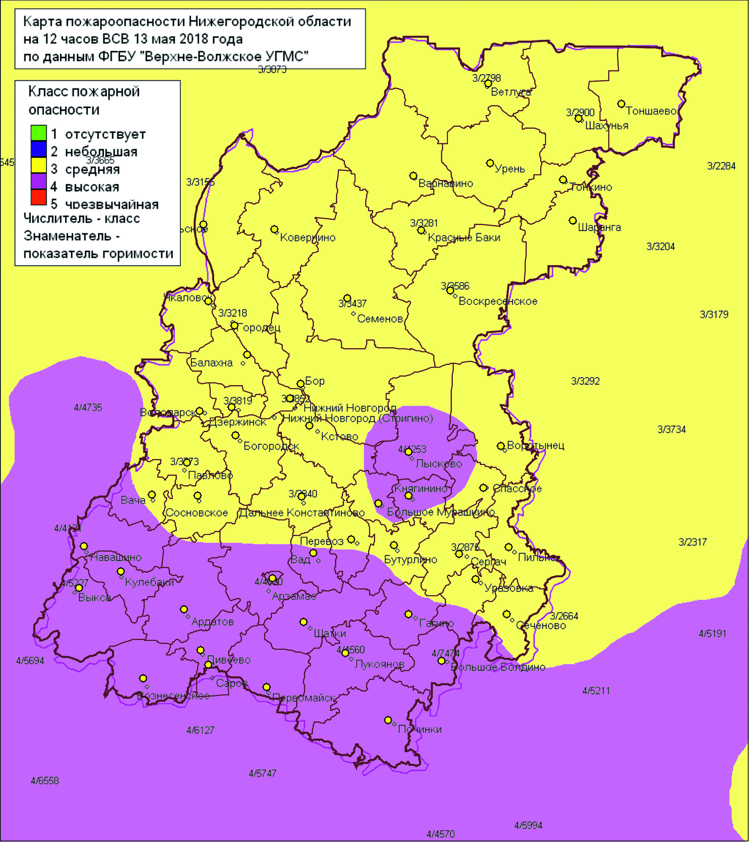 Полностью 3-й класс пожароопасности лесов установился в 24 муниципальных образованиях: г.о. г. Дзержинск, г.о. г. Нижний Новгород, г.о. Семеновский, г.о. Сокольский, г.о. г. Чкаловск, г.о. г. Шахунья, Балахнинский, Богородский, Варнавинский, Ветлужский, Володарский, Воскресенский, Городецкий, Дальнеконстантиновский, Ковернинский, Краснобаковский, Павловский, Пильнинский, Сергачский, Спасский, Тонкинский, Тоншаевский, Уренский, Шарангский районы.