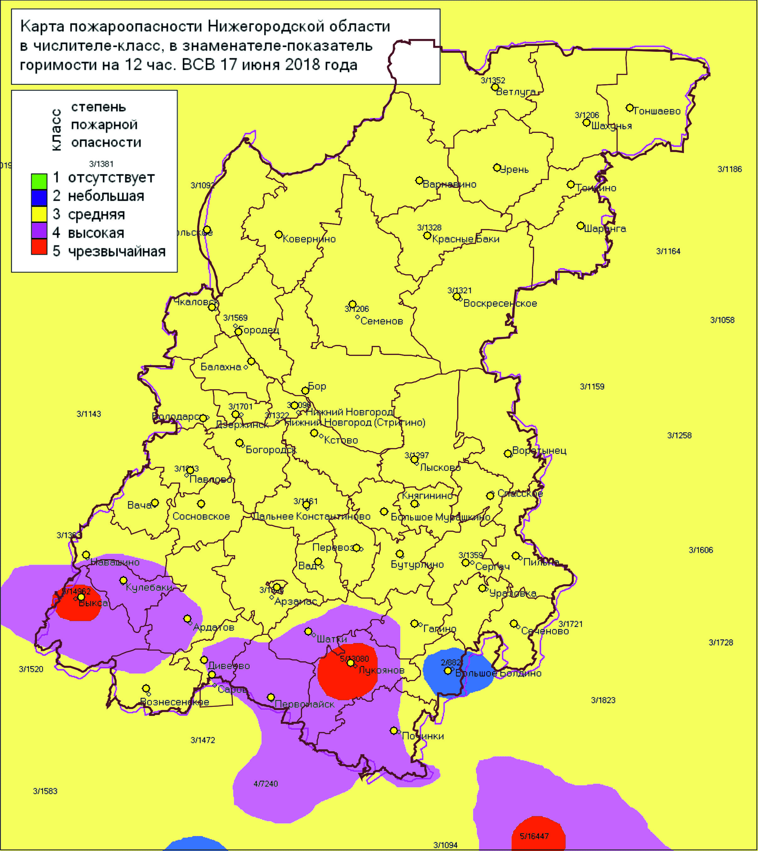 Полностью 3-й класс пожароопасности лесов установился в 39 муниципальных образованиях: г.о. г. Арзамас, г.о. г. Бор, г.о. г. Дзержинск, г.о. г. Нижний Новгород, г.о. Перевозский, г.о. Семеновский, г.о. Сокольский, г.о. г. Чкаловск, г.о. г. Шахунья, Арзамасский, Балахнинский, Богородский, Большемурашкинский, Бутурлинский, Вадский, Варнавинский, Вачский, Ветлужский, Володарский, Воротынский, Воскресенский, Городецкий, Дальнеконстантиновский, Княгининский, Ковернинский, Краснобаковский, Краснооктябрьский, Кстовский, Лысковский, Павловский, Пильнинский, Сергачский, Сеченовский, Сосновский, Спасский, Тонкинский, Тоншаевский, Уренский, Шарангский районы.