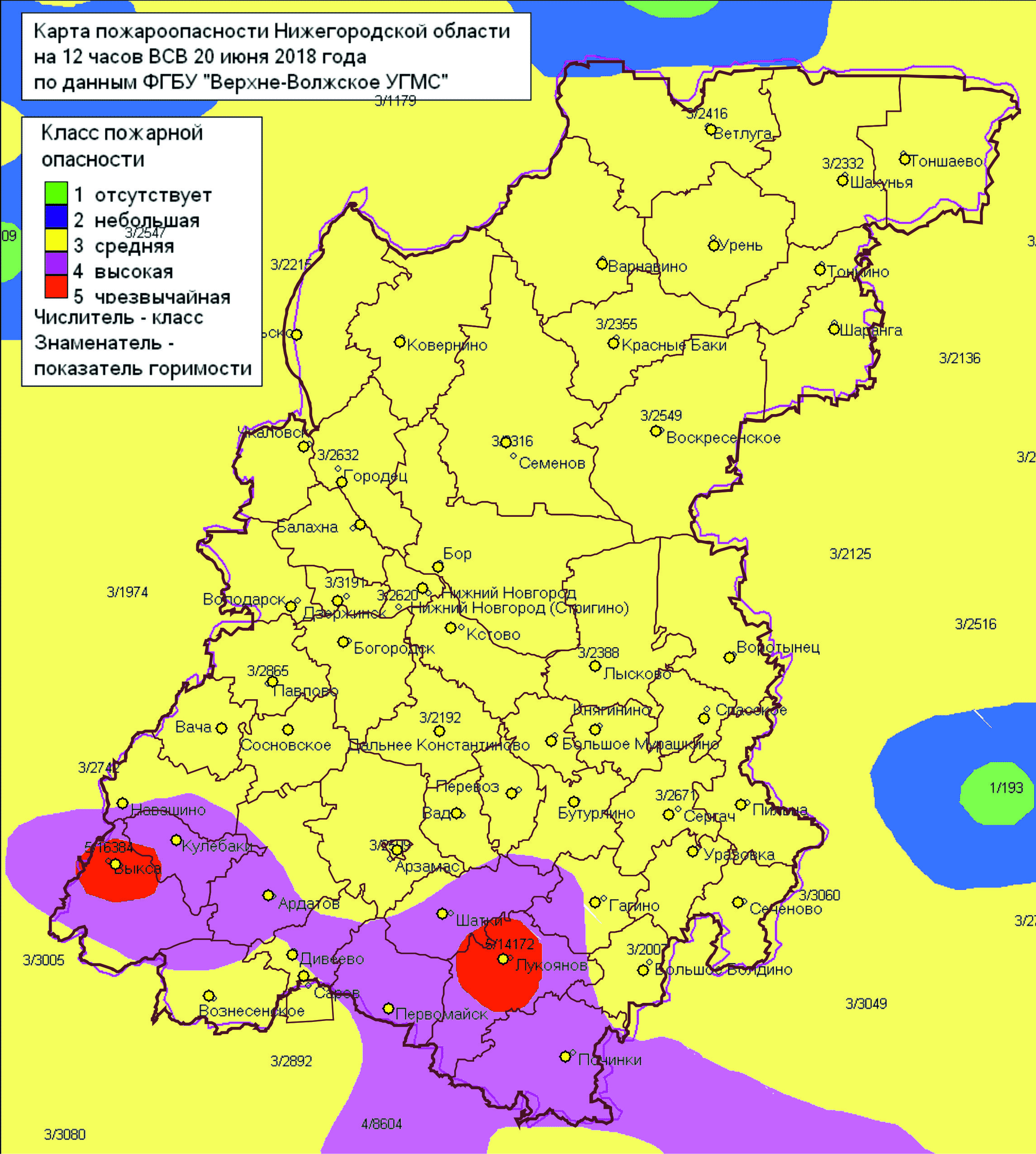 Полностью 3-й класс пожароопасности лесов установился в 37 муниципальных образованиях: г.о. г. Арзамас, г.о. г. Бор, г.о. г. Дзержинск, г.о. г. Нижний Новгород, г.о. Перевозский, г.о. г. Саров, г.о. Семеновский, г.о. Сокольский, г.о. г. Чкаловск, г.о. г. Шахунья, Арзамасский, Балахнинский, Богородский, Большемурашкинский, Варнавинский, Вачский, Володарский, Воротынский, Воскресенский, Городецкий, Дальнеконстантиновский, Княгининский, Ковернинский, Краснобаковский, Краснооктябрьский, Кстовский, Лысковский, Павловский, Пильнинский, Сергачский, Сеченовский, Сосновский, Спасский, Тонкинский, Тоншаевский, Уренский, Шарангский районы.