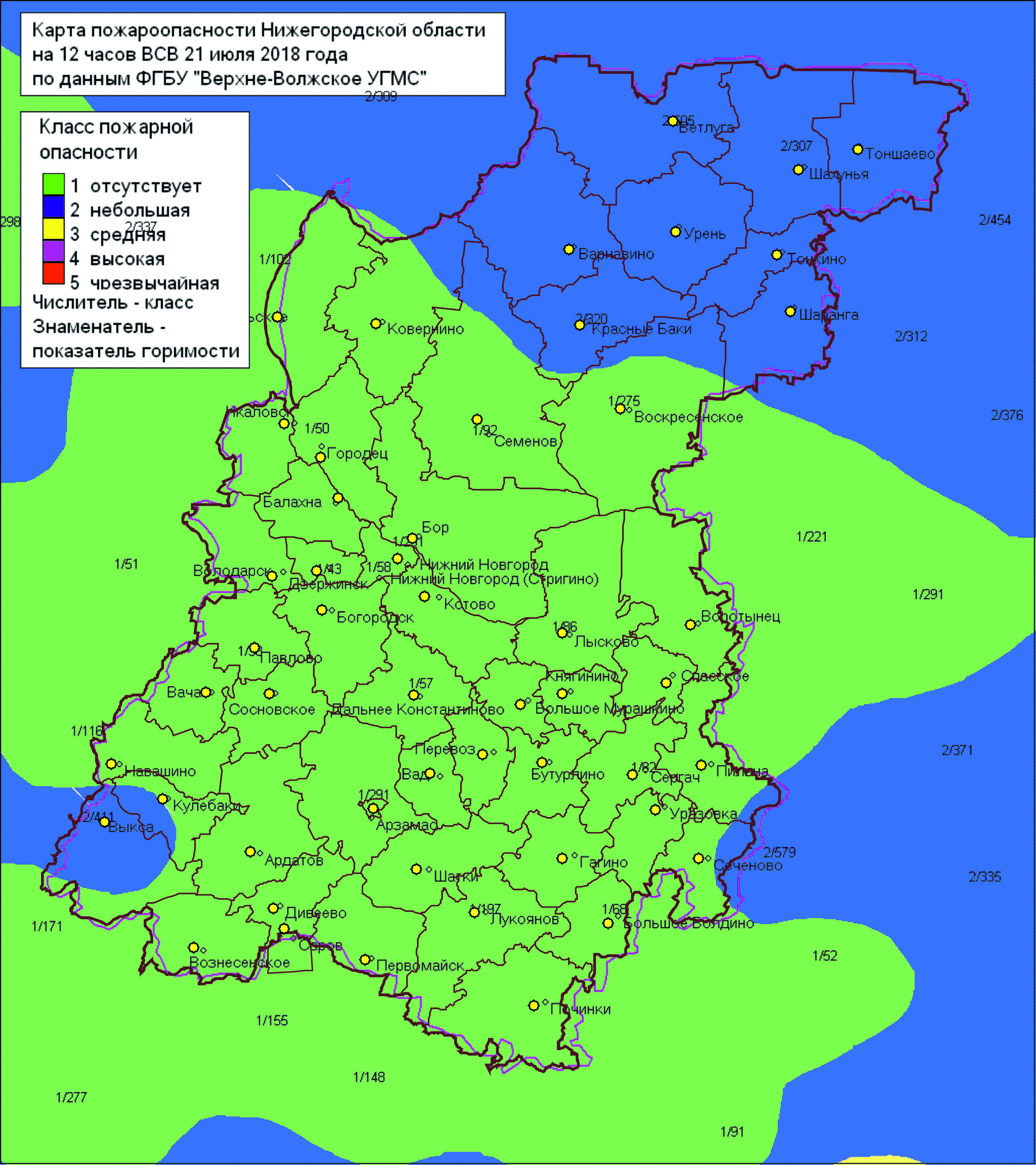 Полностью 1-й класс пожароопасности лесов установился в 37 муниципальных образованиях: г.о. г. Арзамас, г.о. г. Бор, г.о. г. Дзержинск, г.о. Навашинский, г.о. г. Нижний Новгород, г.о. г. Первомайск, г.о. Перевозский, г.о. г. Саров, г.о. Сокольский, г.о. г. Чкаловск, Ардатовский, Арзамасский, Балахнинский, Богородский, Большеболдинский, Большемурашкинский, Бутурлинский, Вадский, Вачский, Вознесенский, Володарский, Воротынский, Гагинский, Городецкий, Дальнеконстантиновский, Дивеевский, Княгининский, Краснооктябрьский, Кстовский, Лукояновский, Лысковский, Павловский, Починковский, Сергачский, Сосновский, Спасский, Шатковский районы.