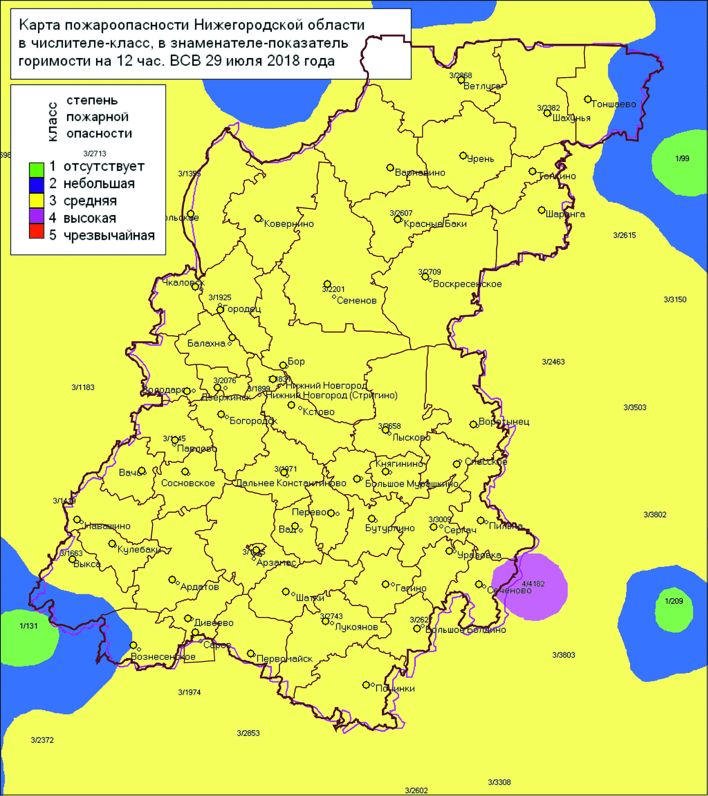 Полностью 3-й класс пожароопасности лесов установился в 48 муниципальных образованиях: г.о. г. Арзамас, г.о. г. Бор, г.о. г. Дзержинск, г.о. г. Кулебаки, г.о. Навашинский, г.о. г. Нижний Новгород, г.о. г. Первомайск, г.о. г. Саров, г.о. Семеновский, г.о. Сокольский, г.о. г. Чкаловск, г.о. г. Шахунья, Ардатовский, Арзамасский, Балахнинский, Богородский, Большеболдинский, Большемурашкинский, Бутурлинский, Вадский, Варнавинский, Вачский, Ветлужский, Володарский, Воротынский, Воскресенский, Гагинский, Городецкий, Дальнеконстантиновский, Дивеевский, Княгининский, Ковернинский, Краснобаковский, Краснооктябрьский, Кстовский, Лукояновский, Лысковский, Павловский, Перевозский, Пильнинский, Починковский, Сергачский, Сосновский, Спасский, Тонкинский, Уренский, Шарангский, Шатковский районы.