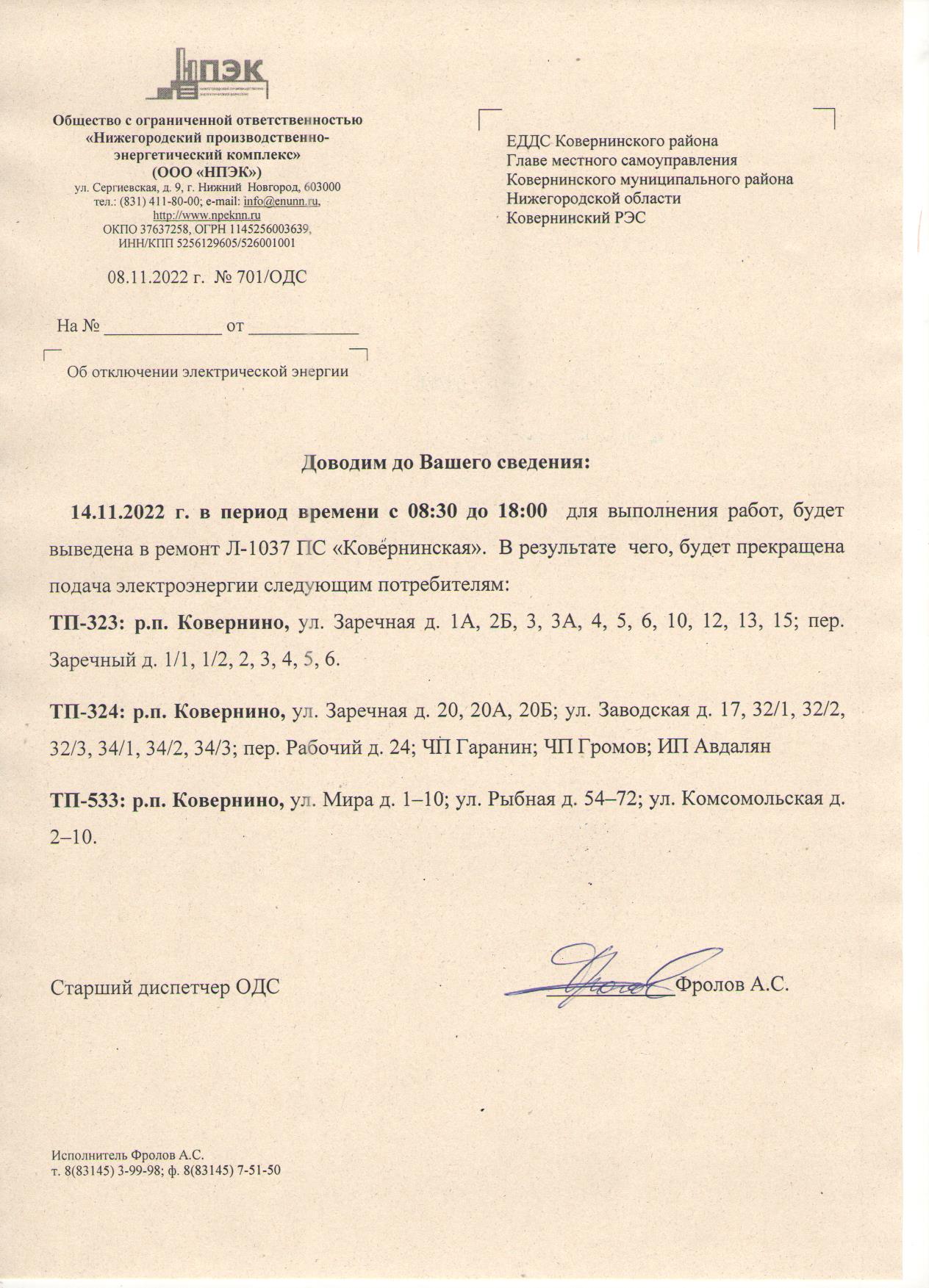 Плановое отключение ЭЭ на 14.11.2022 ООО НПЭК