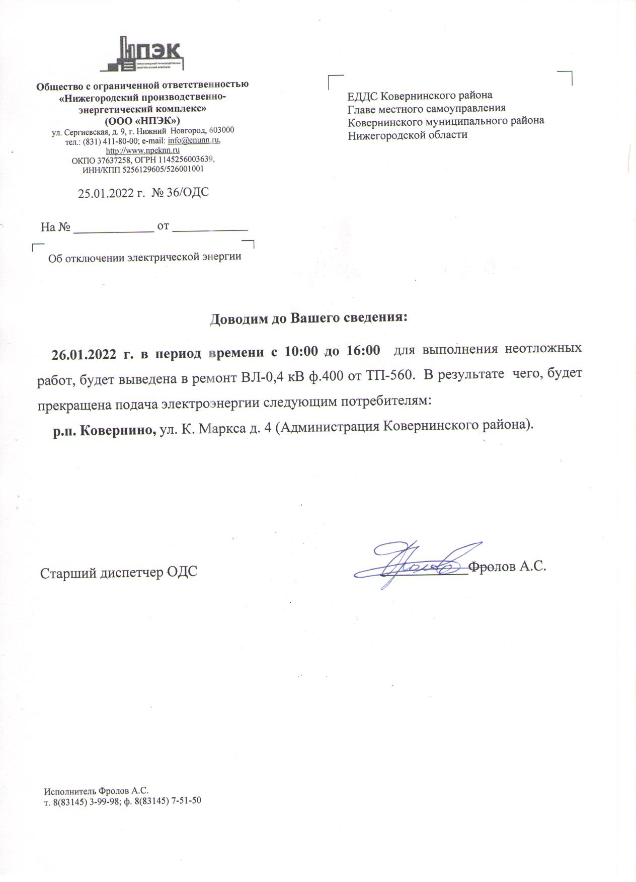 Отключение ЭЭ ООО НПЭК 25.01.2022