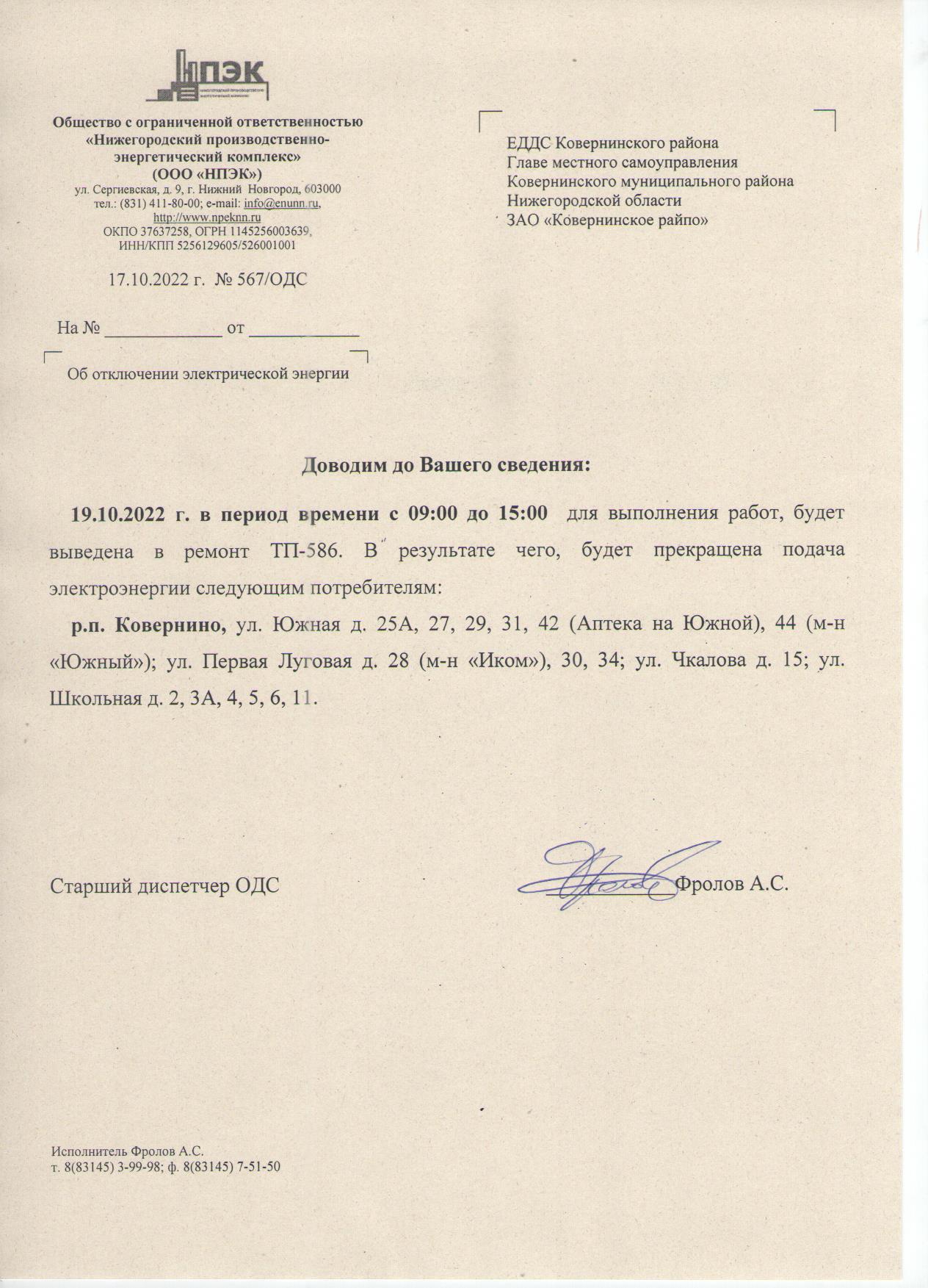 Плановые отключения ЭЭ 19.10.2022 г. ООО НПЭК