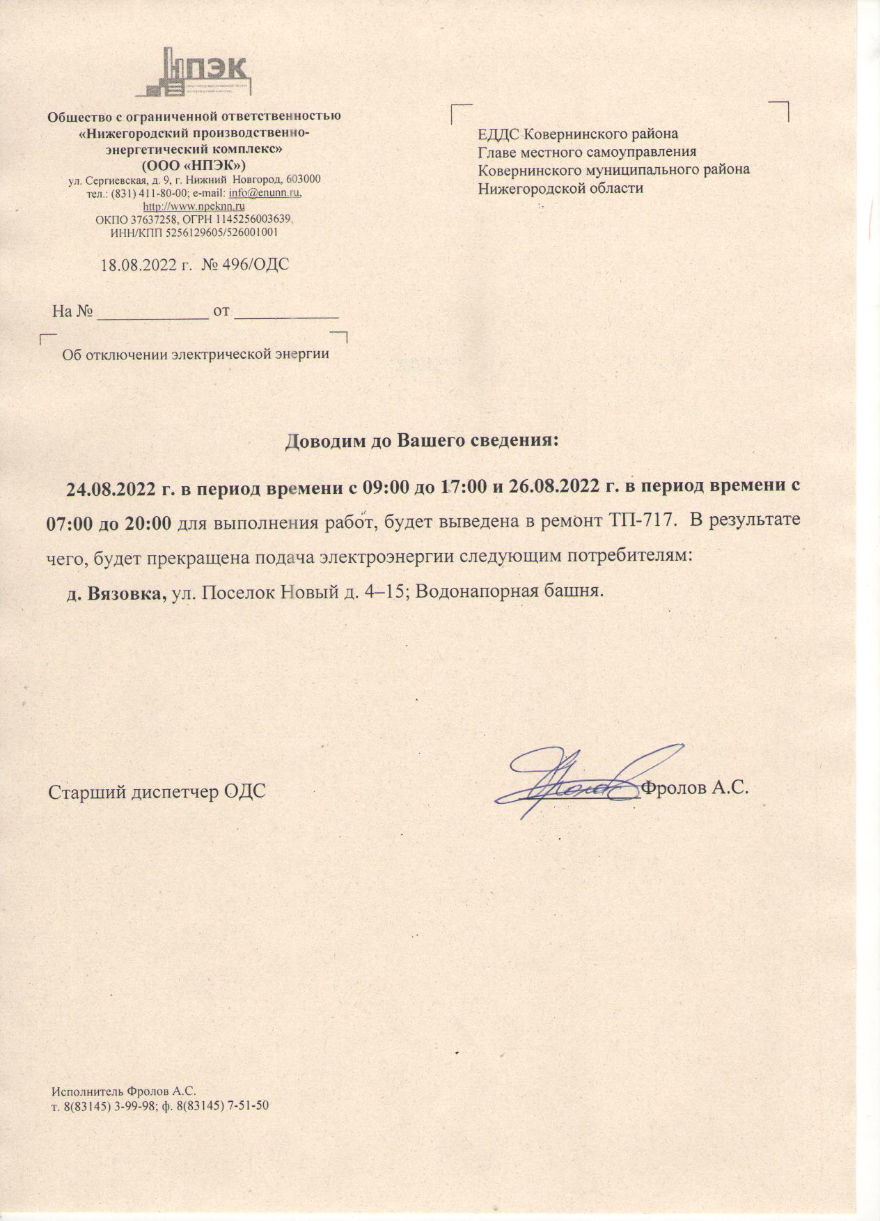 Плановые отключения ЭЭ 24.08.2022 и 26.08.2022 г.