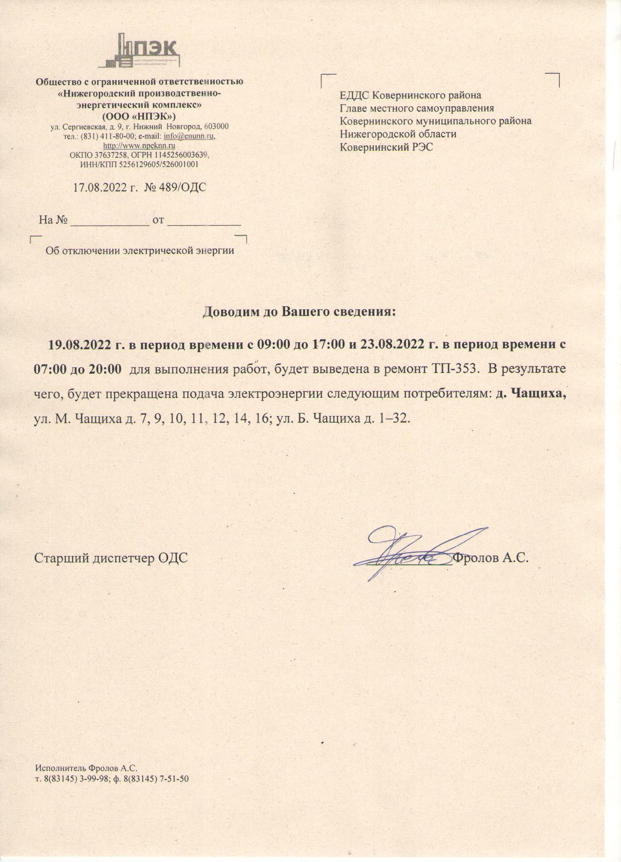 Плановые отключения ЭЭ с 16.08.2022 по 24.08.2022 г.