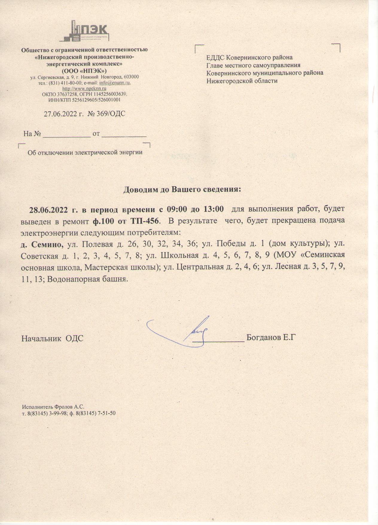 Плановое отключение ЭЭ 27.06.2022 г