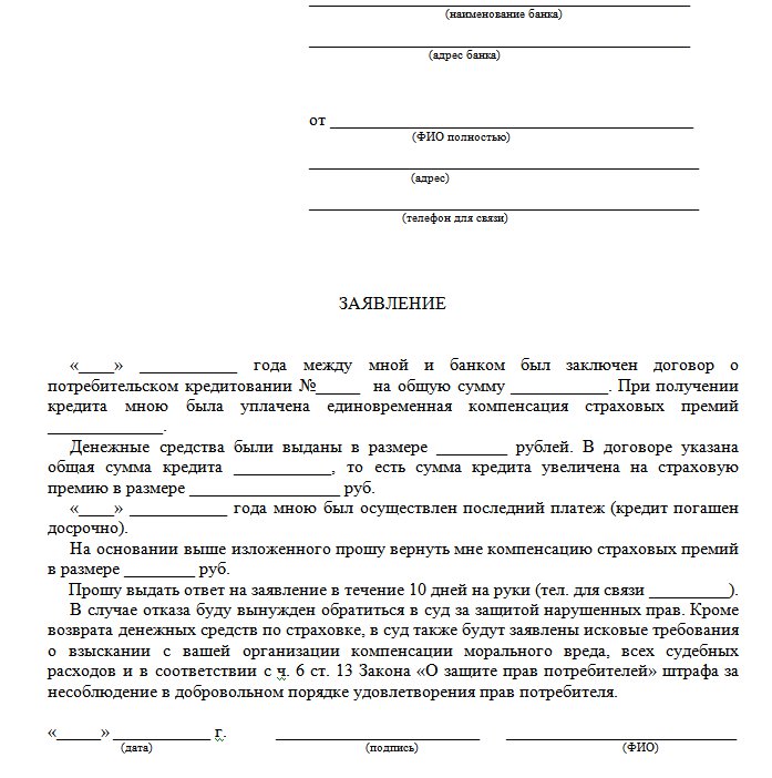 Заявление в банк о возврате страховки